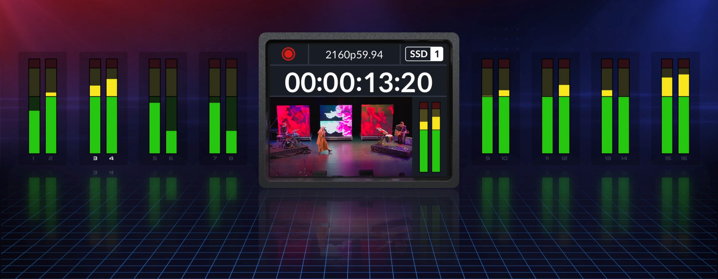 O HyperDeck Studio inclui áudio SDI multicanal profissional para gravar até 16 canais. Ao gravar na entrada SDI, pode selecionar a gravação de 2, 4, 8 ou 16 canais de áudio em tempo real. Há espaço adicional na sobreposição de status de monitoramento SDI, o que permite que a exibição de medidores de áudio mostre todos os canais habilitados ao mesmo tempo, e os medidores de áudio exibirão 2, 4, 8 ou 16 canais simultaneamente. Os medidores de áudio são projetados para usar as balísticas corretas, e pode alternar entre diferentes exibições de medidores VU e PPM no menu LCD. O HyperDeck Studio é mais do que apenas um gravador de vídeo, pois também tem um som fantástico!
