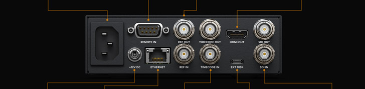Deck miniaturizado para gravação de arquivos H.264, ProRes ou DNxHD em cartões SD/UHS-II ou discos USB externos em formatos SD/HD de até 1080p60. Inclui geradores de timecode, saída/entrada 3G-SDI e saída HDMI.