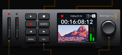 Os botões de controle de transporte no painel frontal incluem funções básicas de decks broadcast, incluindo gravação, reprodução, avanço rápido, retrocesso, clipe anterior, próximo clipe, stop e seleção de entradas. Foram feitos sob medida para corresponder aos decks broadcast tradicionais, assim sua utilização é familiar. Além de tudo, os engenheiros da Blackmagic Design projetaram os botões para que sejam agradáveis ao toque, firmes quando pressionados e altamente confiáveis para resistirem a muitos anos de uso industrial pesado.