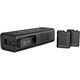 Tudo-em-um: inclui recetor de 2 canais (2,4 GHz), 2 microfones de lapela, acessórios, barra de carregamento e bolsa de transporte