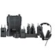O sistema inclui auriculares profissionais tipo LEMO, baterias removíveis e base de carregamento, proporcionando flexibilidade operacional e funcionamento contínuo durante longos períodos de utilização.