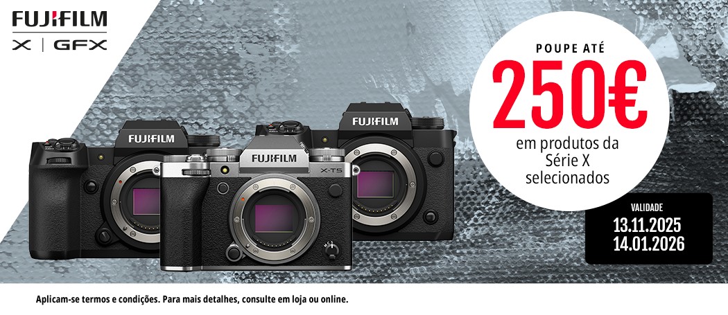 Esta campanha é válida na compra de uma seleção de produtos Fujifilm série X de 13/11/2025 a 14/01/2026. Limitada ao stock existente.