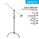 O NANLITE C Stand com encaixe de 5/8" é composto por um tripé tipo C, uma cabeça de aperto de 2,5" e um braço de extensão de 40". O suporte possui um mecanismo de bloqueio patenteado que permite abrir e fixar as pernas facilmente para uma montagem rápida, podendo depois ser dobrado até ficar plano para facilitar o armazenamento.
